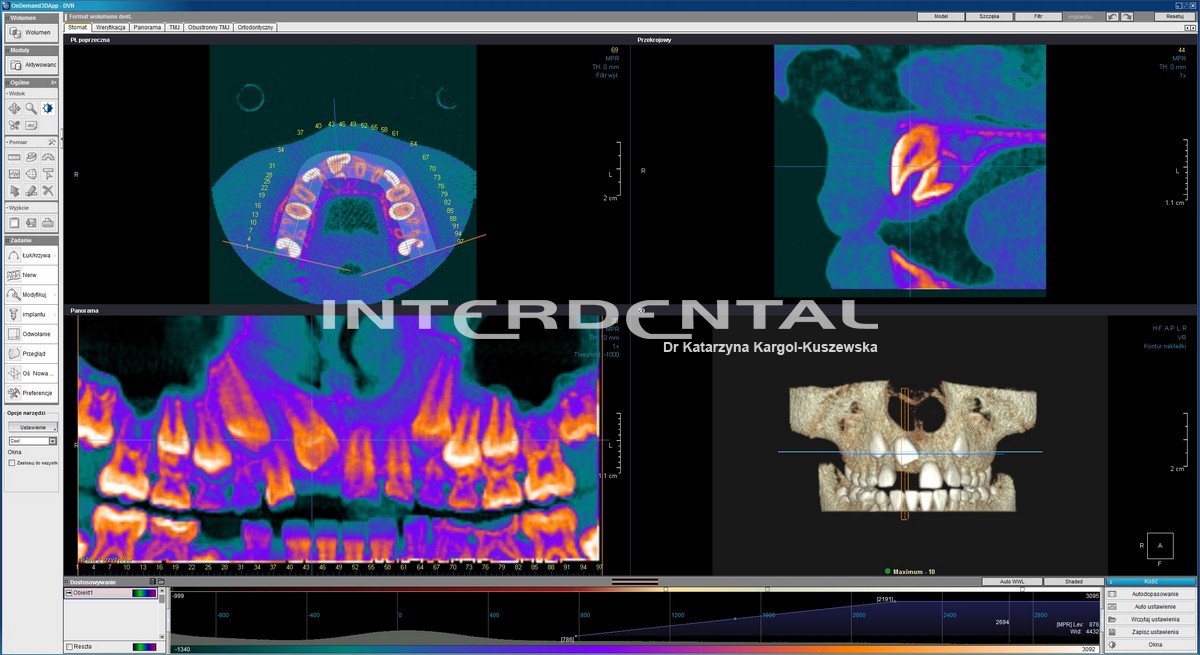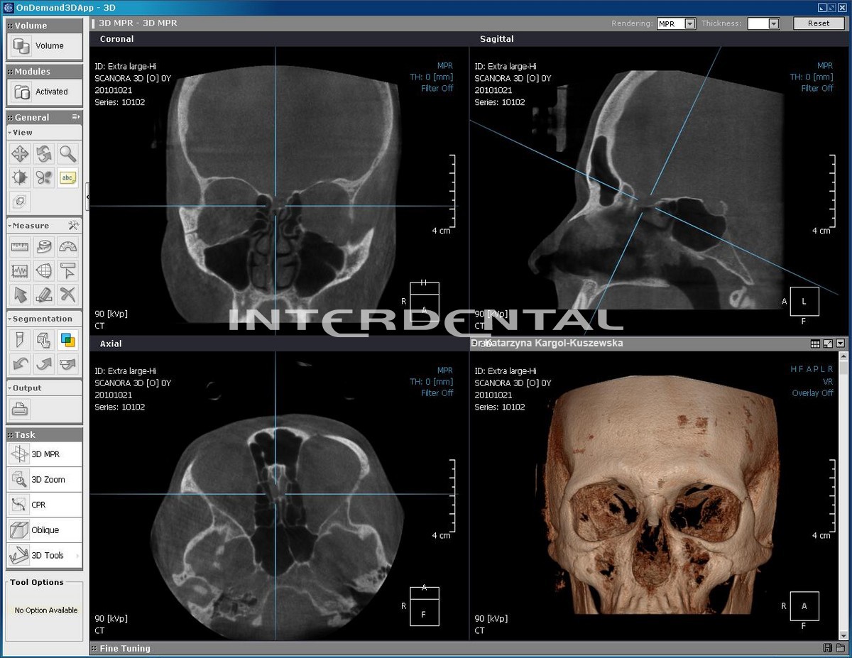 W naszej klinice posiadamy cyfrowy aparat tomograficzny Scanora 3Dx o zwiększonej ilości pól obrazowania od małego S (zastosowanie endodoncja, zęby zatrzymane) do największego XL+ (znajdującego zastosowanie w chirurgii szczękowo-twarzowej i laryngologii dla obrazowania zatok przynosowych, nosa, ucha i gardła).